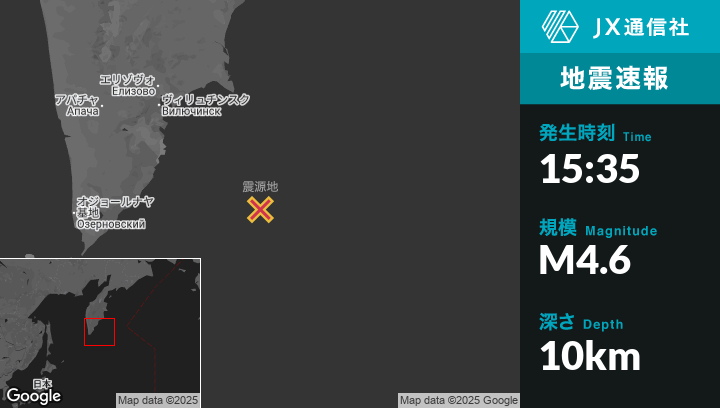 8月06日 15:35頃、ロシアのVilyuchinskから南東210kmの地点でM4.6の地震がありました。