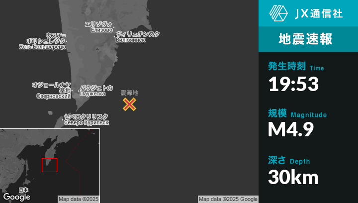 8月06日 19:53頃、ロシアのOzernovskiyから東南東182kmの地点でM4.9の地震がありました。