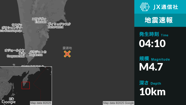 8月08日 04:10頃、ロシアのVilyuchinskから南東194kmの地点でM4.7の地震がありました。