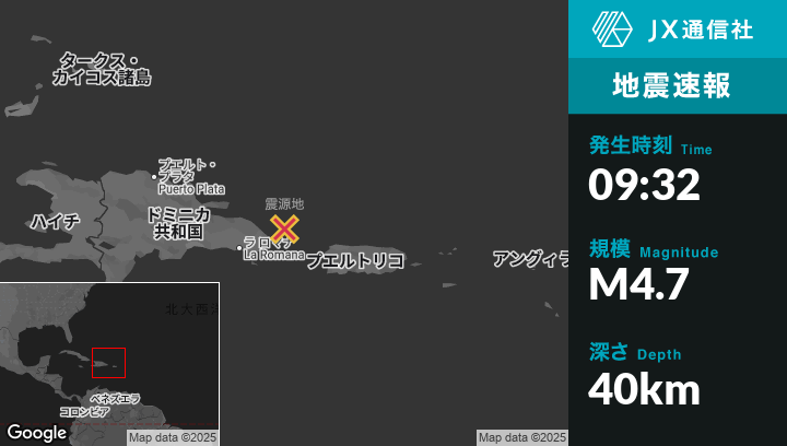 8月08日 09:32頃、ドミニカ共和国のPunta Canaから北東51kmの地点でM4.7の地震がありました。
