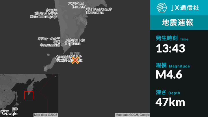 8月08日 13:43頃、ロシアのSevero-Kuril’skから東104kmの地点でM4.6の地震がありました。