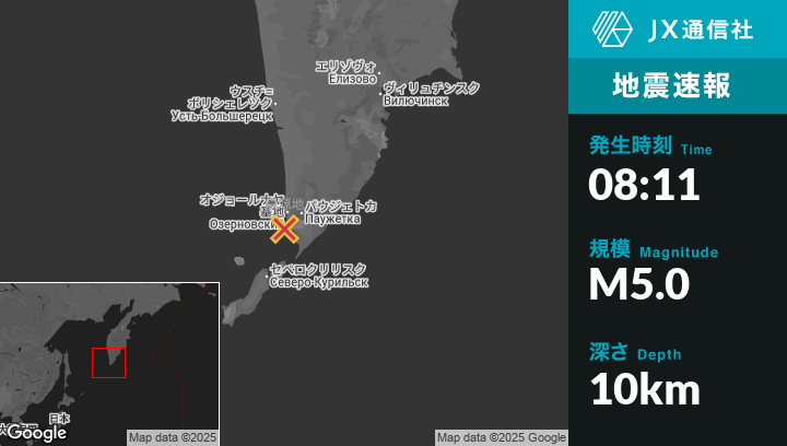 8月09日 08:11頃、ロシアのOzernovskiyから南17kmの地点でM5.0の地震がありました。