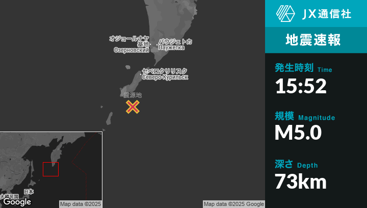 | 震源地 | ロシアのSevero-Kuril’skから南南西95kmの地点 |