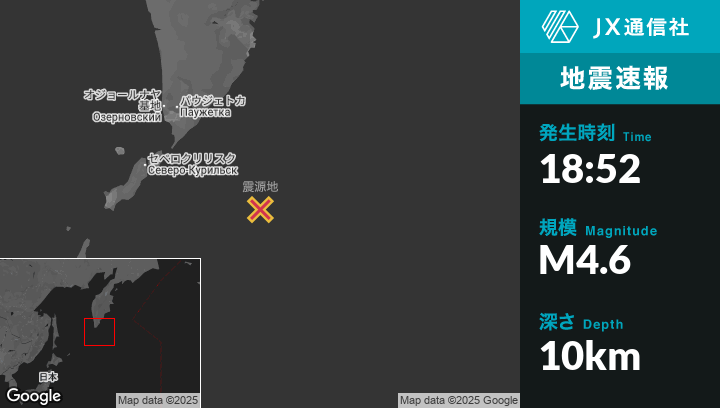 8月09日 18:52頃、ロシアのSevero-Kuril’skから東南東189kmの地点でM4.6の地震がありました。