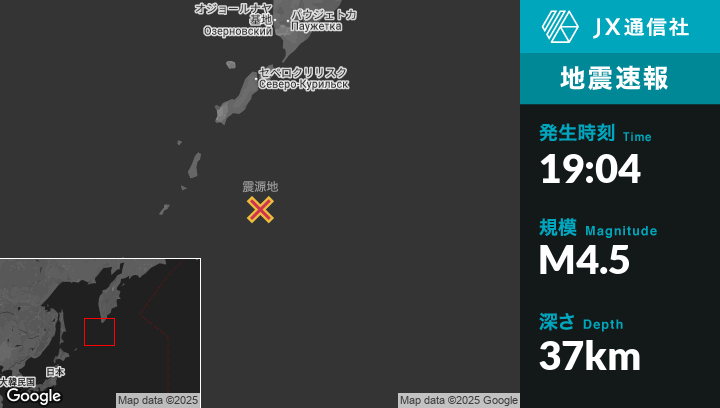 8月09日 19:04頃、ロシアのSevero-Kuril’skから南198kmの地点でM4.5の地震がありました。