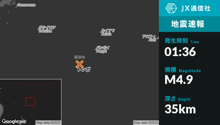 8月11日 01:36頃、トンガのHoumaから北北西56kmの地点でM4.9の地震がありました。
