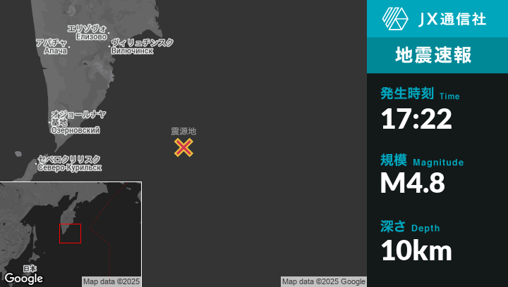 8月12日 17:22頃、ロシアのVilyuchinskから南東260kmの地点でM4.8の地震がありました。