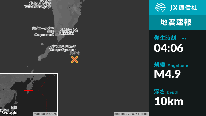 8月13日 04:06頃、ロシアのSevero-Kuril’skから東南東145kmの地点でM4.9の地震がありました。