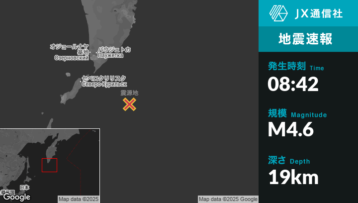 | 震源地 | ロシアのSevero-Kuril’skから東南東164kmの地点 |