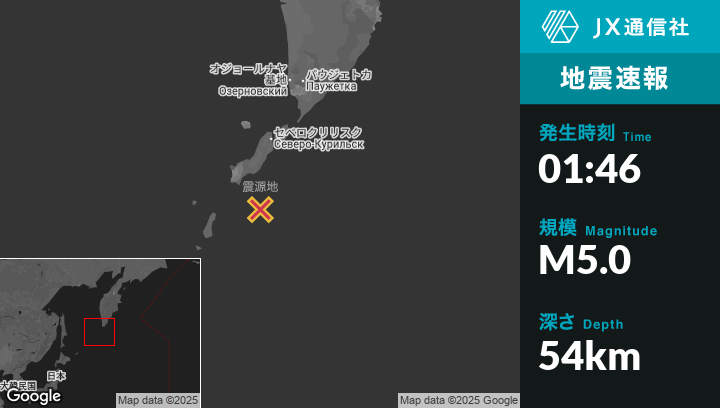 | 震源地 | ロシアのSevero-Kuril’skから南104kmの地点 |