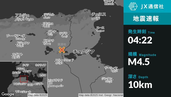 | 震源地 | チュニジアのChebikaから西38kmの地点 |
