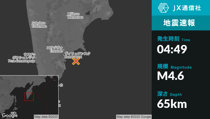| 震源地 | ロシアのPetropavlovsk-Kamchatskyから南東58kmの地点 |