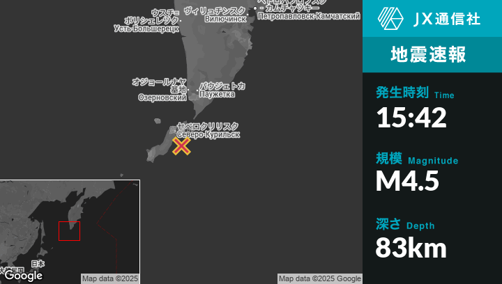 8月22日 15:42頃、ロシアのSevero-Kuril’skから南南東29kmの地点でM4.5の地震がありました。