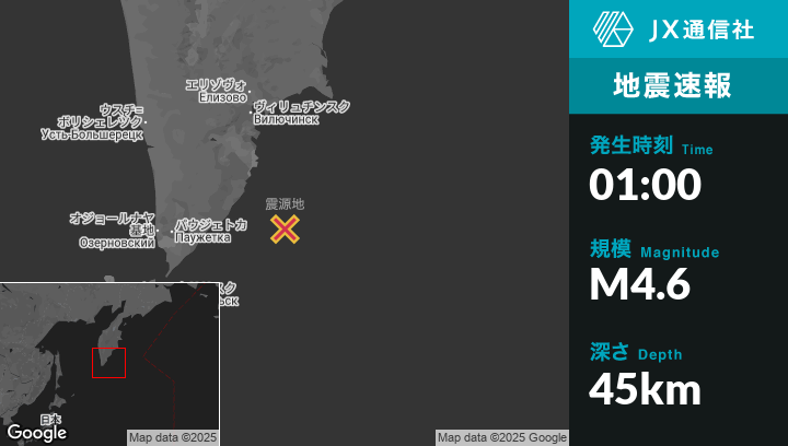 9月24日 01:00頃、ロシアのVilyuchinskから南南東157kmの地点でM4.6の地震がありました。