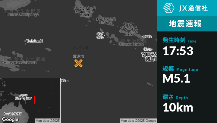 9月25日 17:53頃、ソロモン諸島のGizoから南西292kmの地点でM5.1の地震がありました。