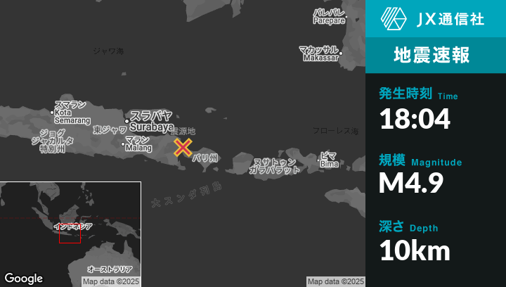9月25日 18:04頃、インドネシアのWongsorejoから東北東12kmの地点でM4.9の地震がありました。