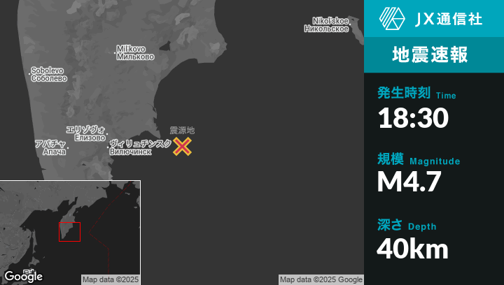 9月25日 18:30頃、ロシアのPetropavlovsk-Kamchatskyから東140kmの地点でM4.7の地震がありました。