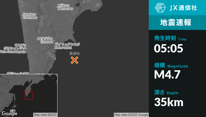 | 震源地 | ロシアのPetropavlovsk-Kamchatskyから南東121kmの地点 |