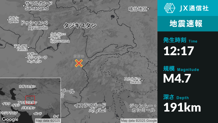 9月26日 12:17頃、アフガニスタンのJurmから南南東47kmの地点でM4.7の地震がありました。