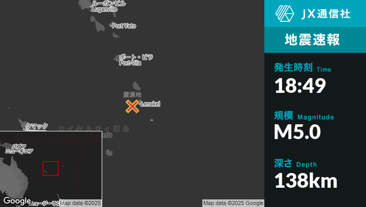 9月27日 18:49頃、バヌアツのIsangelから西32kmの地点でM5.0の地震がありました。