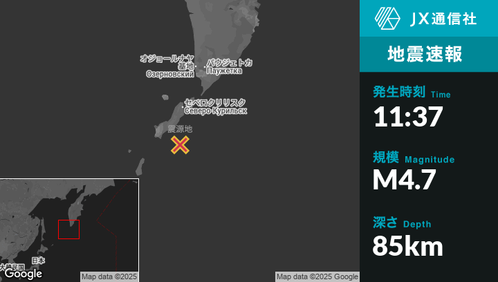 9月28日 11:37頃、ロシアのSevero-Kuril’skから南78kmの地点でM4.7の地震がありました。