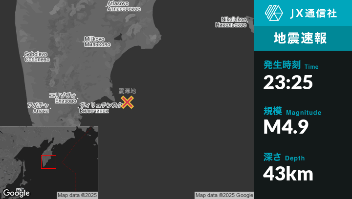 | 震源地 | ロシアのPetropavlovsk-Kamchatskyから東131kmの地点 |