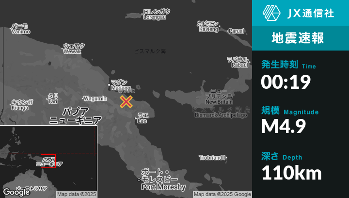 | 震源地 | パプアニューギニアのKainantuから東北東89kmの地点 |