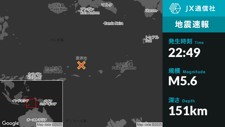 10月01日 22:49頃、東ティモールのLospalosから北東197kmの地点でM5.6の地震がありました。