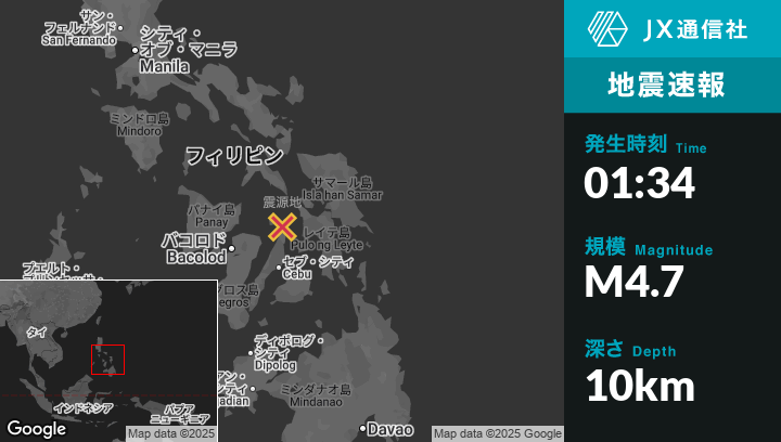 10月02日 01:34頃、フィリピンのPaypayから北北西1kmの地点でM4.7の地震がありました。