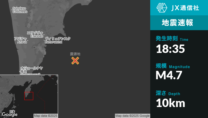 | 震源地 | ロシアのPetropavlovsk-Kamchatskyから南東181kmの地点 |