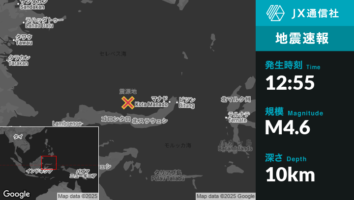 10月03日 12:55頃、インドネシアのGorontaloから北113kmの地点でM4.6の地震がありました。