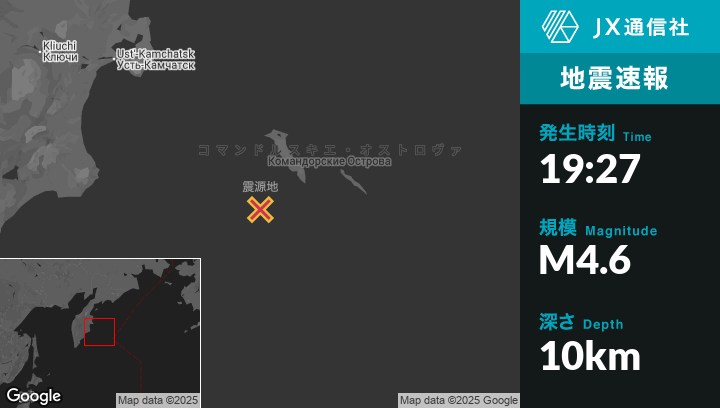 10月03日 19:27頃、ロシアのUst’-Kamchatsk Staryyから南東285kmの地点でM4.6の地震がありました。