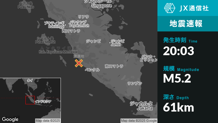 | 震源地 | インドネシアのSungai Penuhから南100kmの地点 |