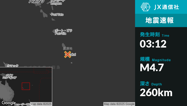 10月04日 03:12頃、バヌアツのIsangelから東北東24kmの地点でM4.7の地震がありました。