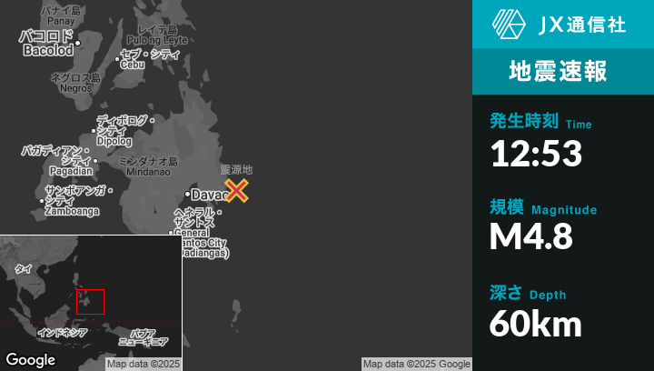 10月10日 12:53頃、フィリピンのSantiagoから東24kmの地点でM4.8の地震がありました。