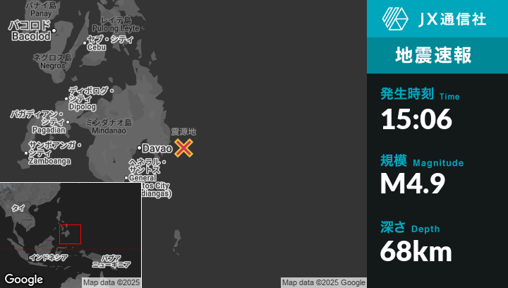10月10日 15:06頃、フィリピンのSantiagoから東南東47kmの地点でM4.9の地震がありました。