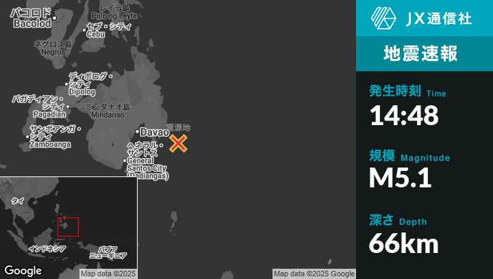 10月10日 14:48頃、フィリピンのJovellarから東南東58kmの地点でM5.1の地震がありました。