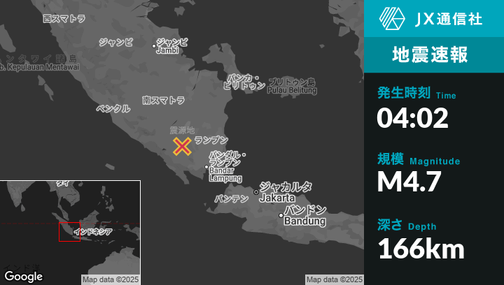 | 震源地 | インドネシアのKotabumiから西北西47kmの地点 |