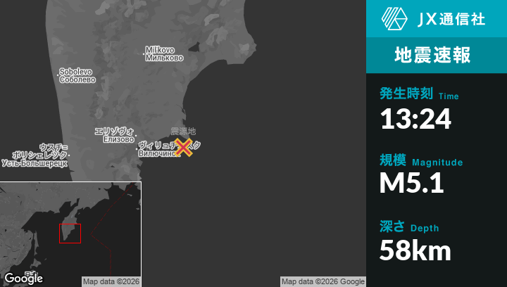 | 震源地 | ロシアのPetropavlovsk-Kamchatskyから東81kmの地点 |