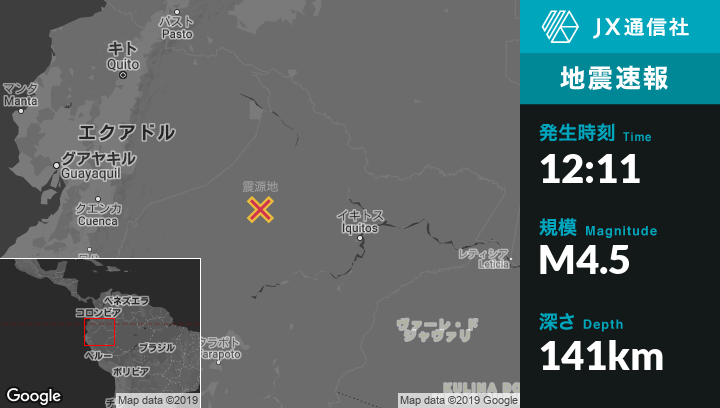 4月15日 12:11頃、ペルーのBarrancaから北東244kmの地点でM4.5の地震がありました。