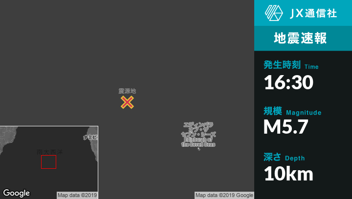 4月16日 16:30頃、セントヘレナのEdinburgh of the Seven Seasから西北西348kmの地点でM5.7の地震がありました。