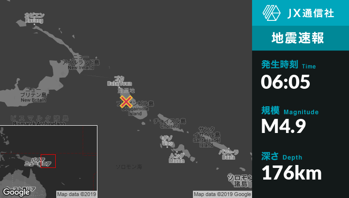 4月19日 06:05頃、パプアニューギニアのArawaから西北西69kmの地点でM4.9の地震がありました。