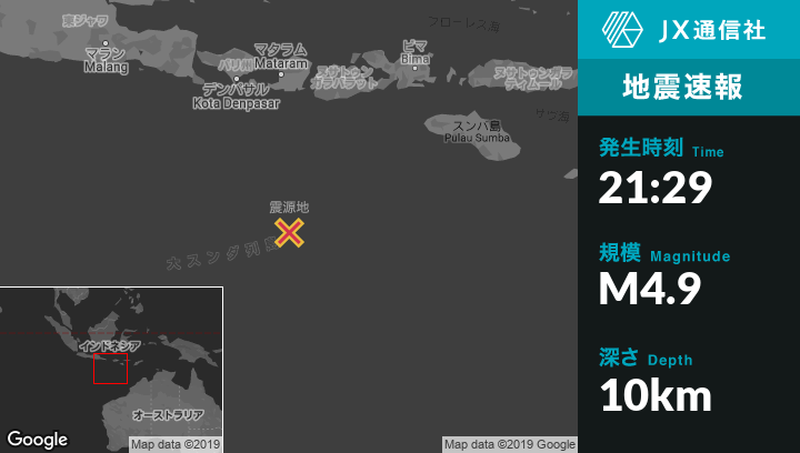 4月19日 21:29頃、インドネシアのKuteから南292kmの地点でM4.9の地震がありました。