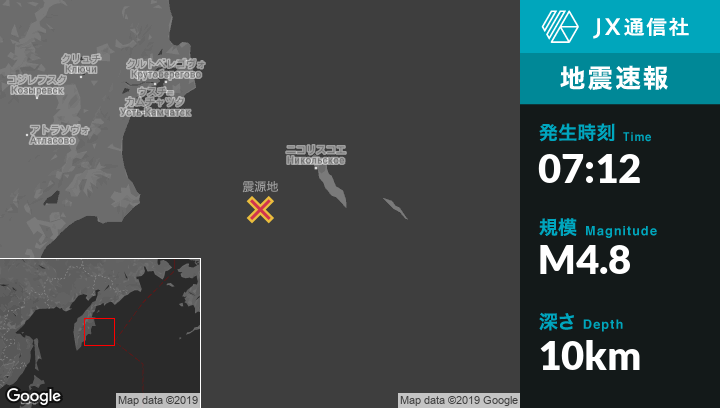 4月21日 07:12頃、ロシアのNikol'skoyeから西南西93kmの地点でM4.8の地震がありました。