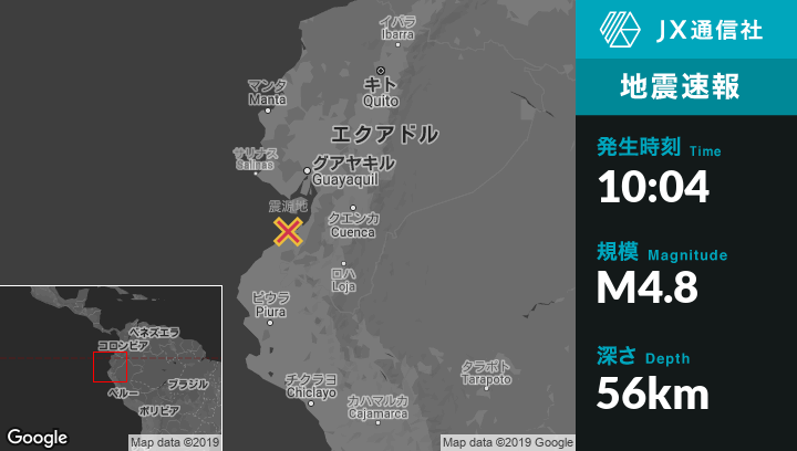 4月22日 10:04頃、ペルーのAguas Verdesから北北西26kmの地点でM4.8の地震がありました。