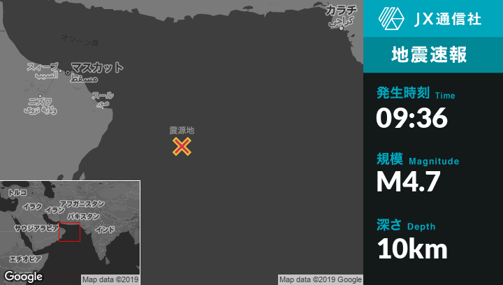 | 震源地 | オマーンのSurから東南東277kmの地点 |