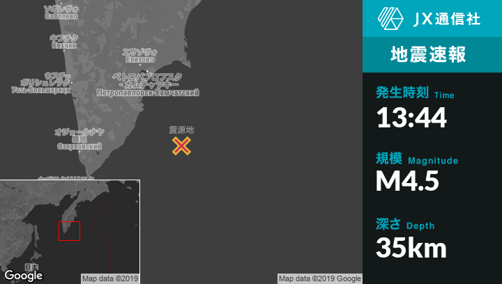 4月24日 13:44頃、ロシアのVilyuchinskから南南東167kmの地点でM4.5の地震がありました。