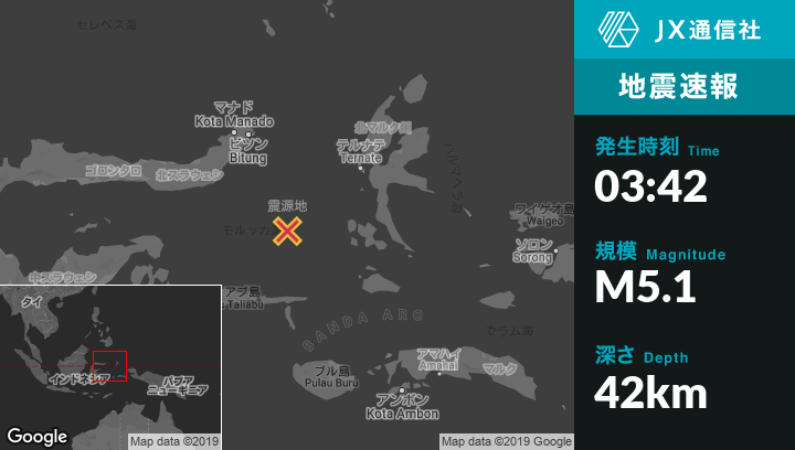 4月25日 03:42頃、インドネシアのDofaから北北東169kmの地点でM5.1の地震がありました。