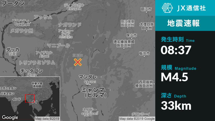 | 震源地 | ミャンマーのMawlaikから東78kmの地点 |