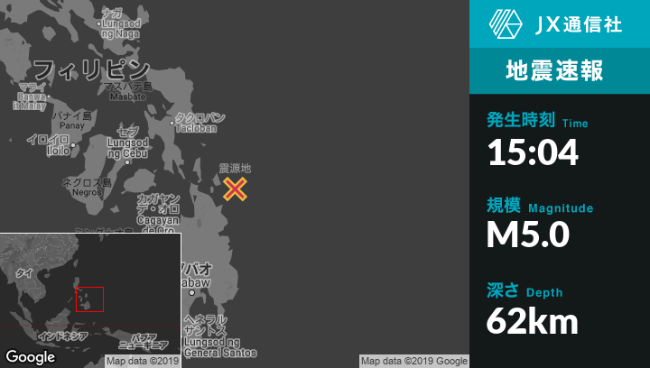 震源地フィリピンのGeneral Lunaから東37kmの地点